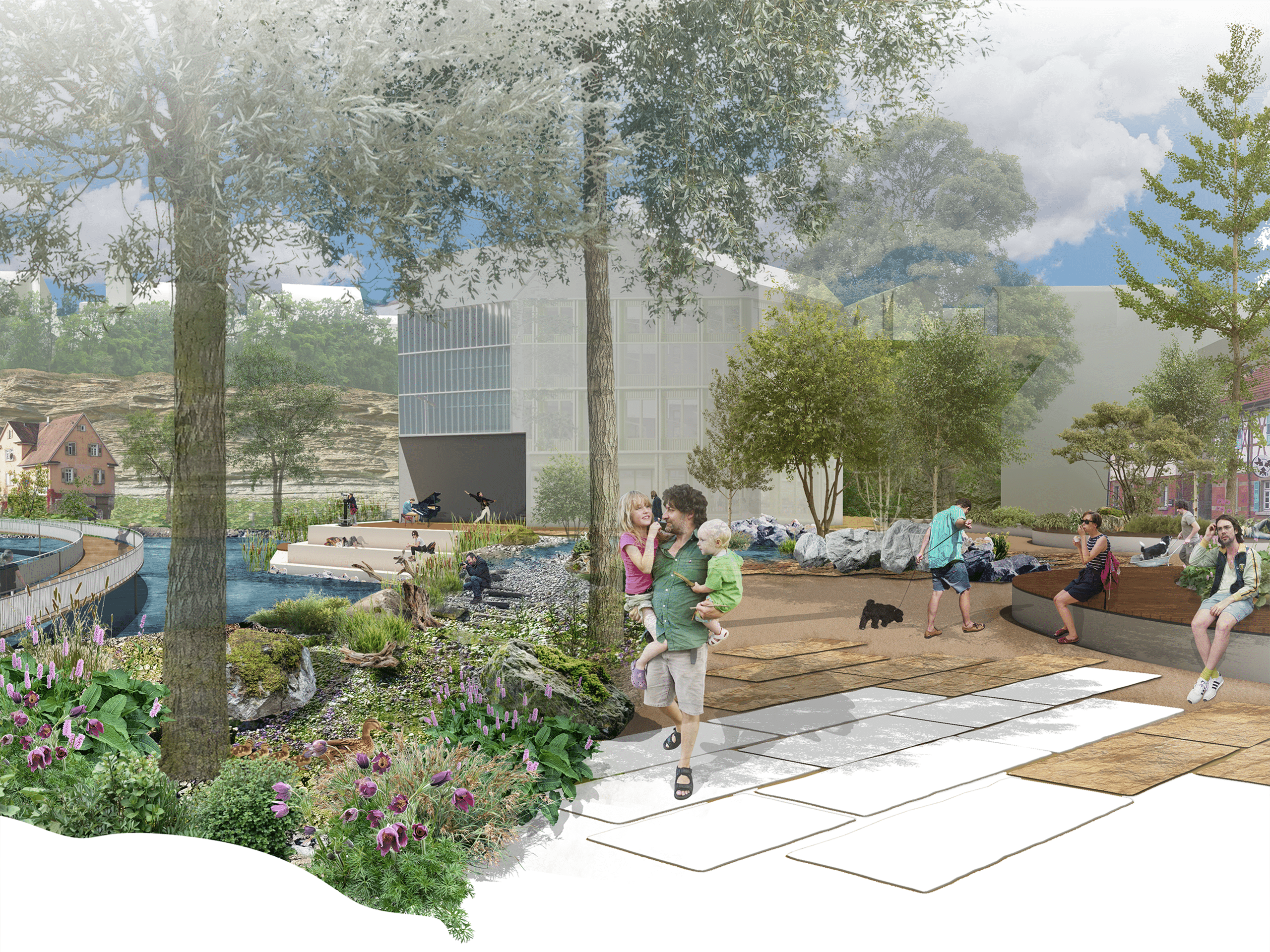 Perspektive Platz Murr Aue: Der Eintritt auf den Platz Murr Aue gestaltet einen Übergang in einen natürlich anmutenden, aber weiterhin uneingeschränkt nutzbaren Quartiersplatz. Bild: Merlin Pott01.10.25 / Merlin Pott